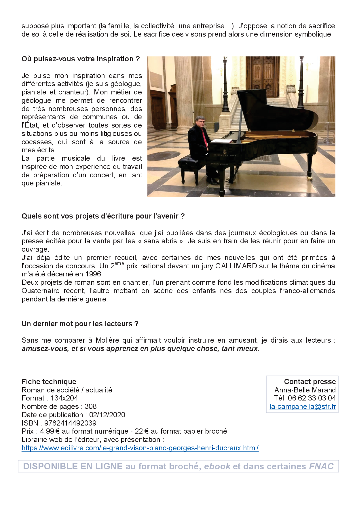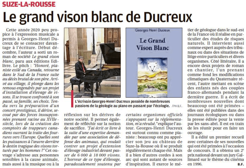 Article annonçant la sortie du roman Le Grand Vison Blanc.